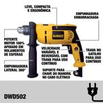 Furadeira de impacto com mandril 1/2” oferece maior capacidade de trabalho e melhor retenção da broca. Possui empunhadura lateral 360° para excelente controle e versatilidade, texturizada com segurador leve que oferece maior conforto e controle ao usuário. Com aberturas de ventilação de ar ajudam na refrigeração do motor para uma longa vida útil e potente motor 100% apoiado em rolamentos de esferas.