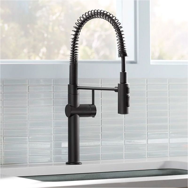 Torneira de estilo profissional com mangueira revestida fácil de limpar e bobina removível.